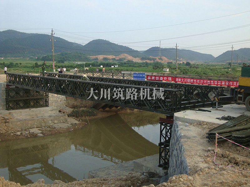 特點(diǎn):本鋼橋由國防科技大學(xué)全程指導(dǎo)和監(jiān)督安裝,滿足荷載80T施工車輛通行,因施工場地要求,采用貝雷梁組合式橋墩,安裝拆除方便,穩(wěn)定性好。采用推出法安裝,安裝周期20天,于2011年5月25日通車。